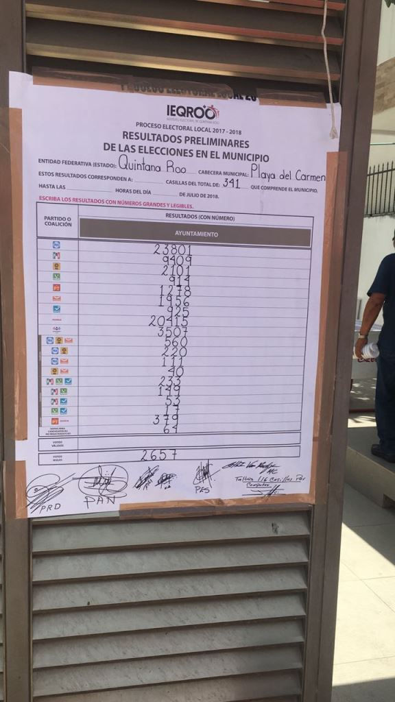 En el acta general de resultados preliminares que integrantes del Consejo Municipal del IEQROO publicó en las puertas de sus instalaciones, se dio a conocer un amplio margen de boletas contabilizadas a favor de Cristina Torres, quién registró un total de 28 mil 789 votos contra 22 mil 072 de Laura Beristain, candidata de la coalición “Juntos Haremos Historia”, siendo una diferencia de 6,717 boletas a favor de la abanderada del frente, cifra que según Torres Gómez, podría cerrarse en una sexta parte al final del conteo.