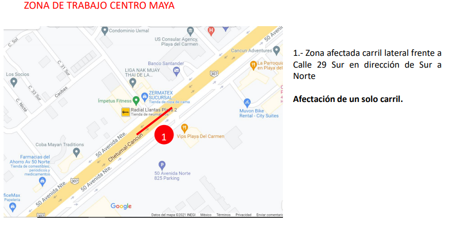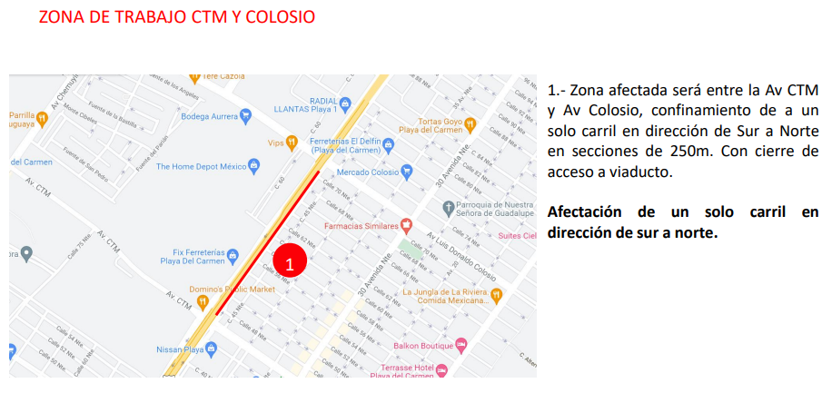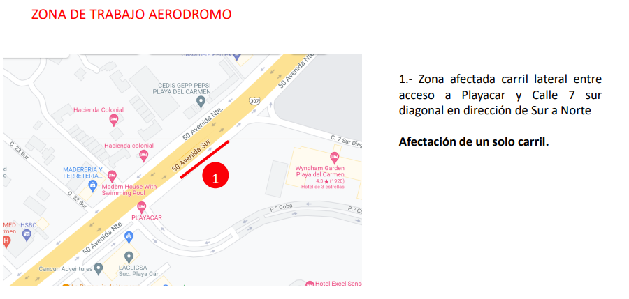 La empresa señaló que en la zona de Centro Maya se afectará el carril lateral, frente a la calle 29 Sur, en dirección de sur a norte, mientras que en el área del aeródromo se suspenderá la circulación en el carril lateral, entre el acceso a Playacar y la calle 7 sur diagonal, también de sur a norte.