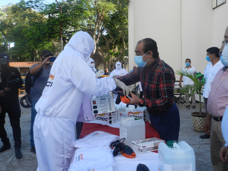 Con la presencia del dirigente nacional de la CROC, Isaías González Cuevas, el líder estatal Martín de la Cruz Gómez y el dirigente de la delegación 56 en Benito Juárez, Mario Machuca Sánchez, esta mañana se llevó a cabo la entrega de equipos nebulizadores y overoles a las personas conforman las brigadas de sanitización.