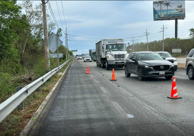 Automovilistas que circulaban en la zona advirtieron que las maniobras que realizan trabajadores inexpertos en las obras de rehabilitación que se realizan por el primer fallido trazo del Tren Maya están provocando riesgos innecesarios para automovilistas al realizar repentinos e inadecuados cierres de carril que ya han estado a punto de provocar accidentes. (Agencia SIM)