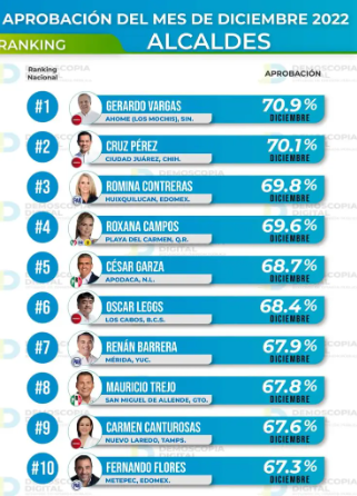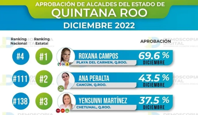PLAYA DEL CARMEN, Q.ROO, 8 de enero.- La presidenta municipal de Solidaridad, Lili Campos se ubica en el Top 5 en el Ranking de Alcaldes de México, con casi un 70 por ciento de aceptación en el estudio de opinión, realizado por la consultoría política Demoscopia.